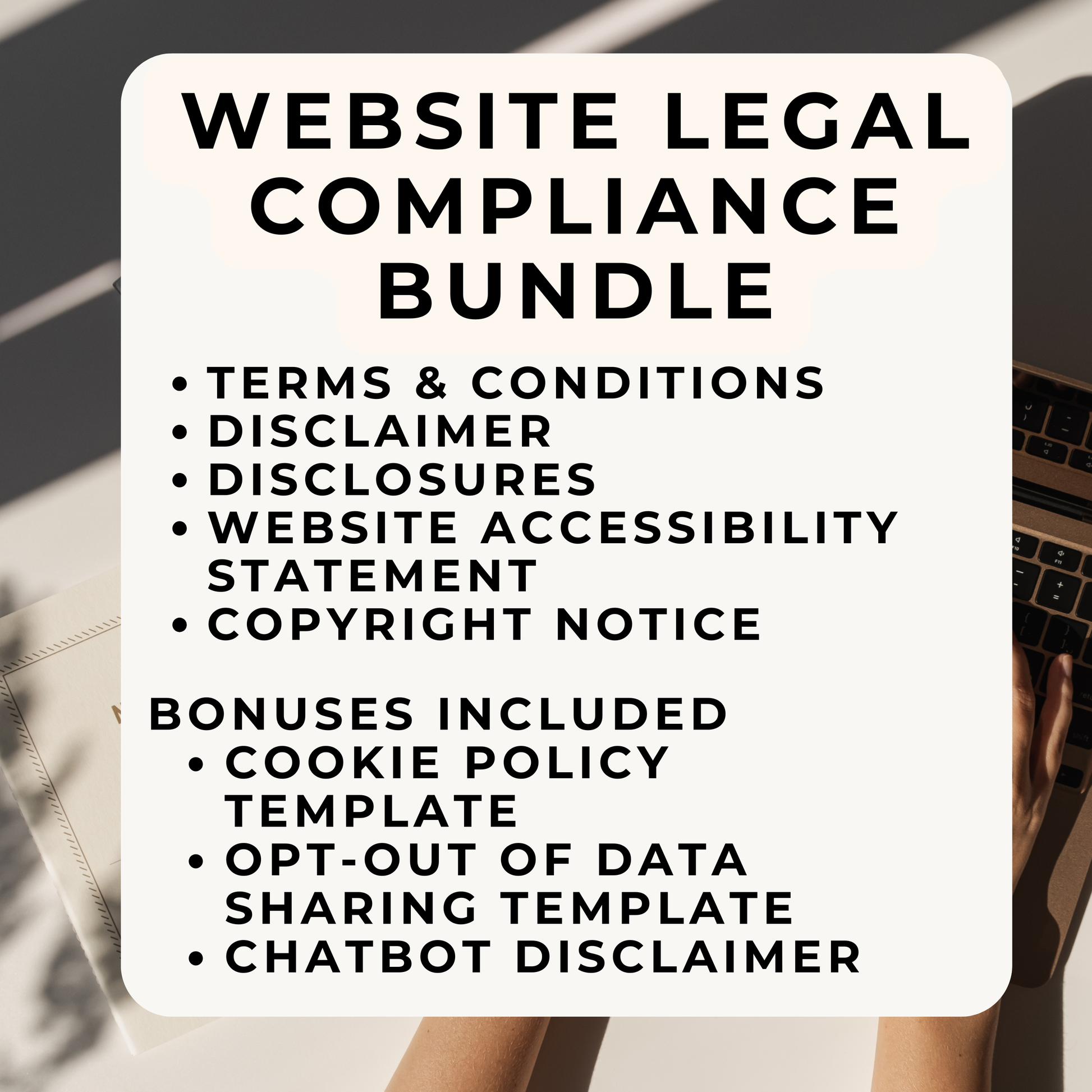In today's digital age, ensuring your website is compliant with legal standards is crucial. Don’t risk costly fines, lawsuits or damage to your reputation. Our Website Compliance Bundle offers a complete set of tools to help you protect your business effortlessly.